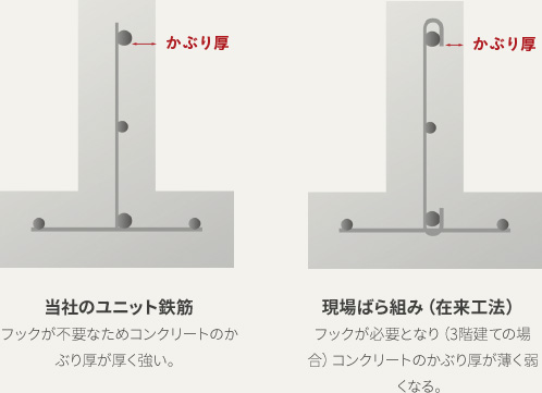また、特殊な溶接で接合することにより、在来工法で必要な180°フックの緊結と同等以上の性能を発揮するため、あばら筋端部にはフックを設けません。