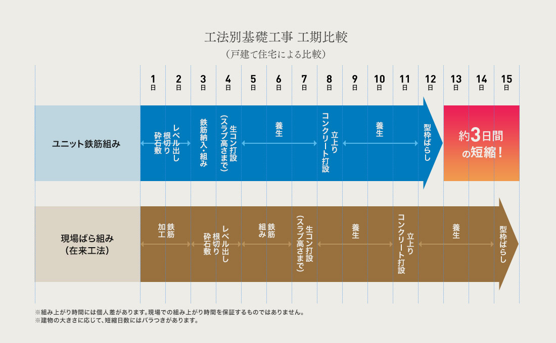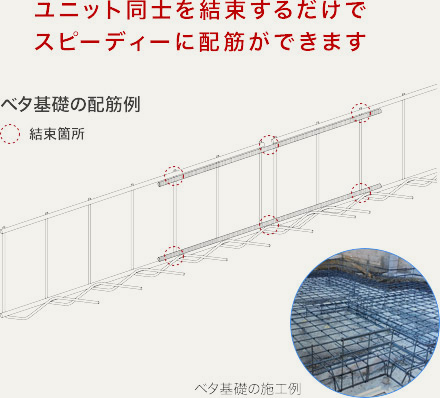基礎鉄筋ユニットとは、事前に工場で溶接を用いユニット化し、現場でユニット相互を固定して組み上げるためのプレ加工鉄筋です。